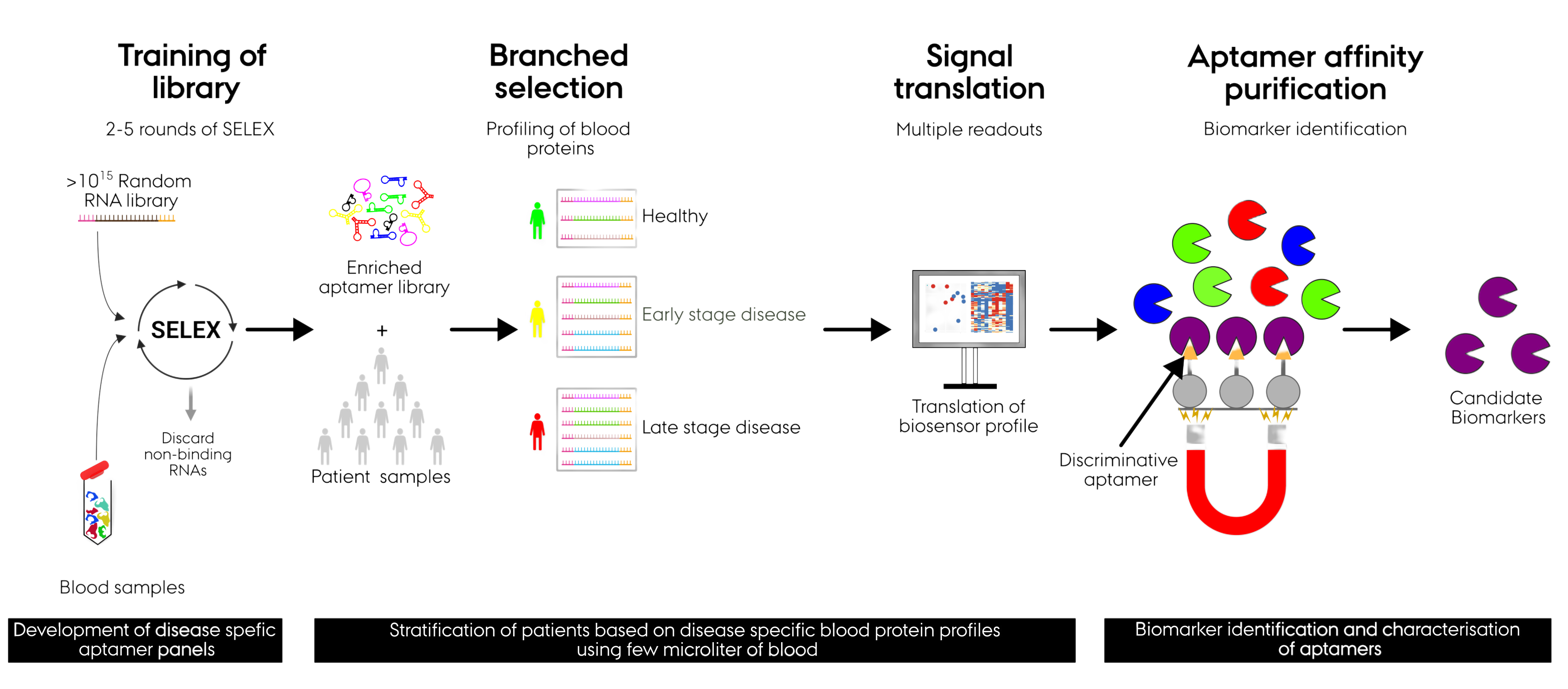 Our APTASHAPE method addresses these shortcomings by including a “training” step where a multitude of disease-specific protein biomarkers are identified prior to screening of patient groups. The general applicability and reproducibility of APTASHAPE have been validated across several disease indications using medium-sized independent cohorts (60-200 individuals).